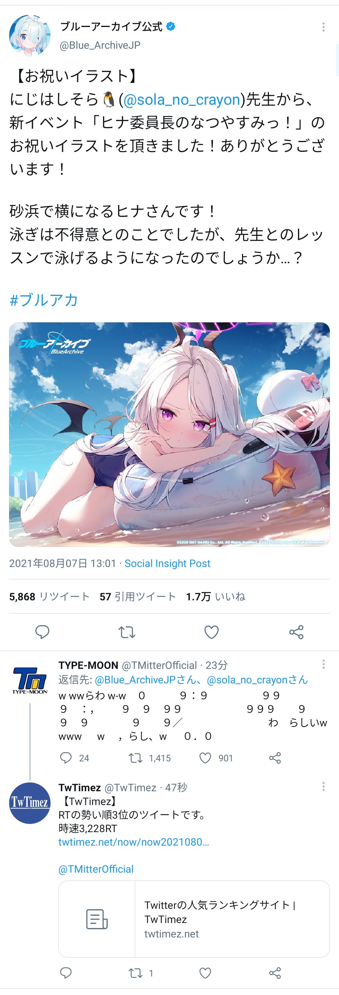 【悲報】TYPE-MOONツイッター、ブルアカの公式アカウントに怪文書リプをしてしまうwww