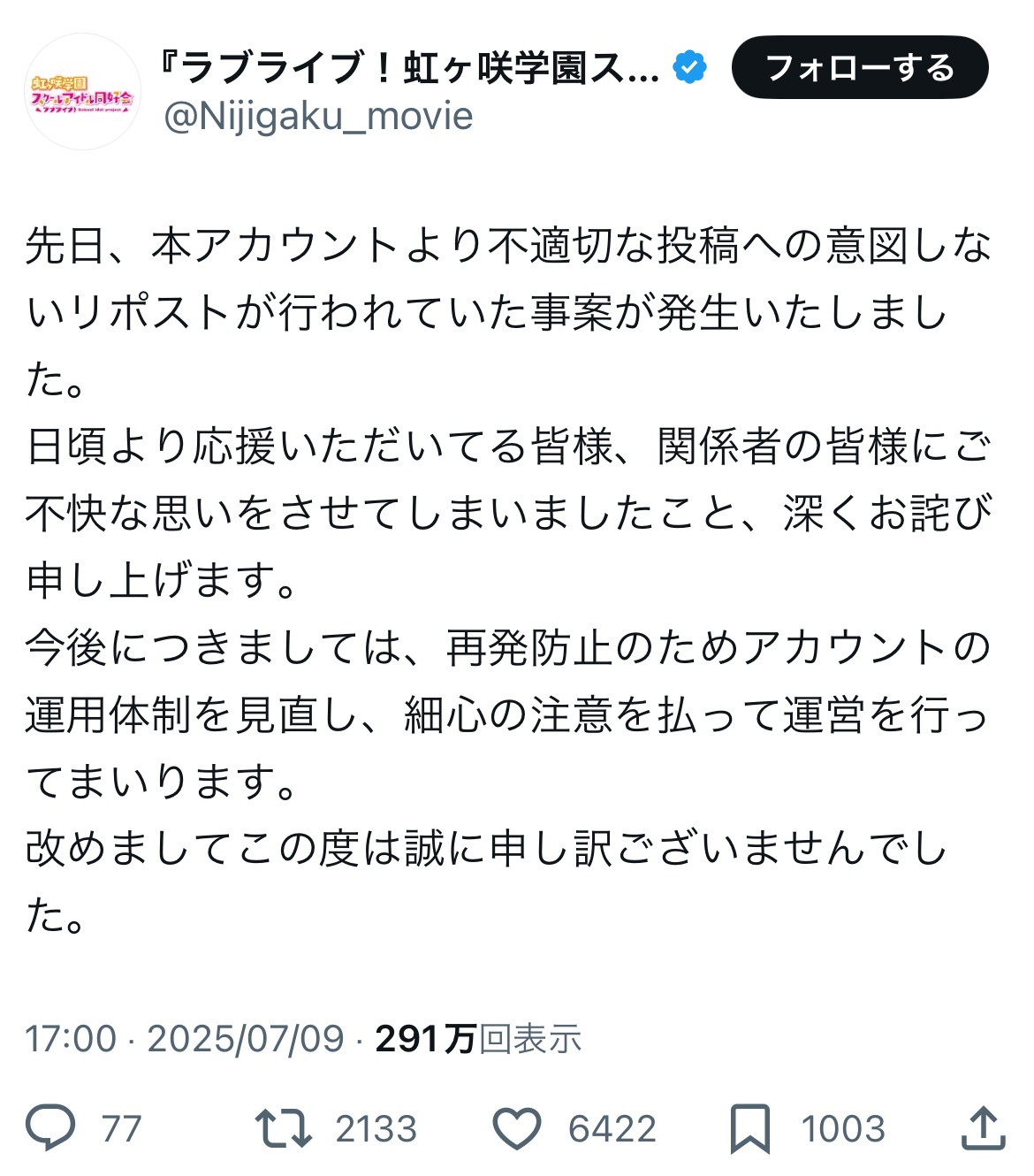【朗報】ラブライブ公式、例の「やらかしリポスト」を猛省するwwww