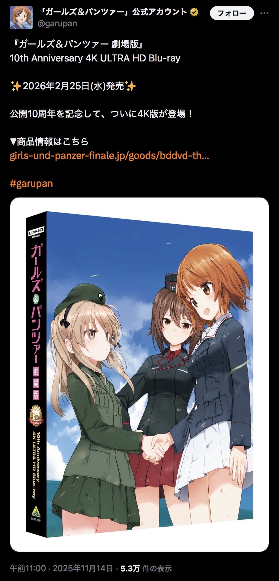 「ガールズ&パンツァー」最終章第5話が2026年公開と発表、らぶらぶ作戦も控えてファンへの供給は無限軌道!劇場版公開10周年記念で初の4K ULTRA HD化決定、予約開始!!