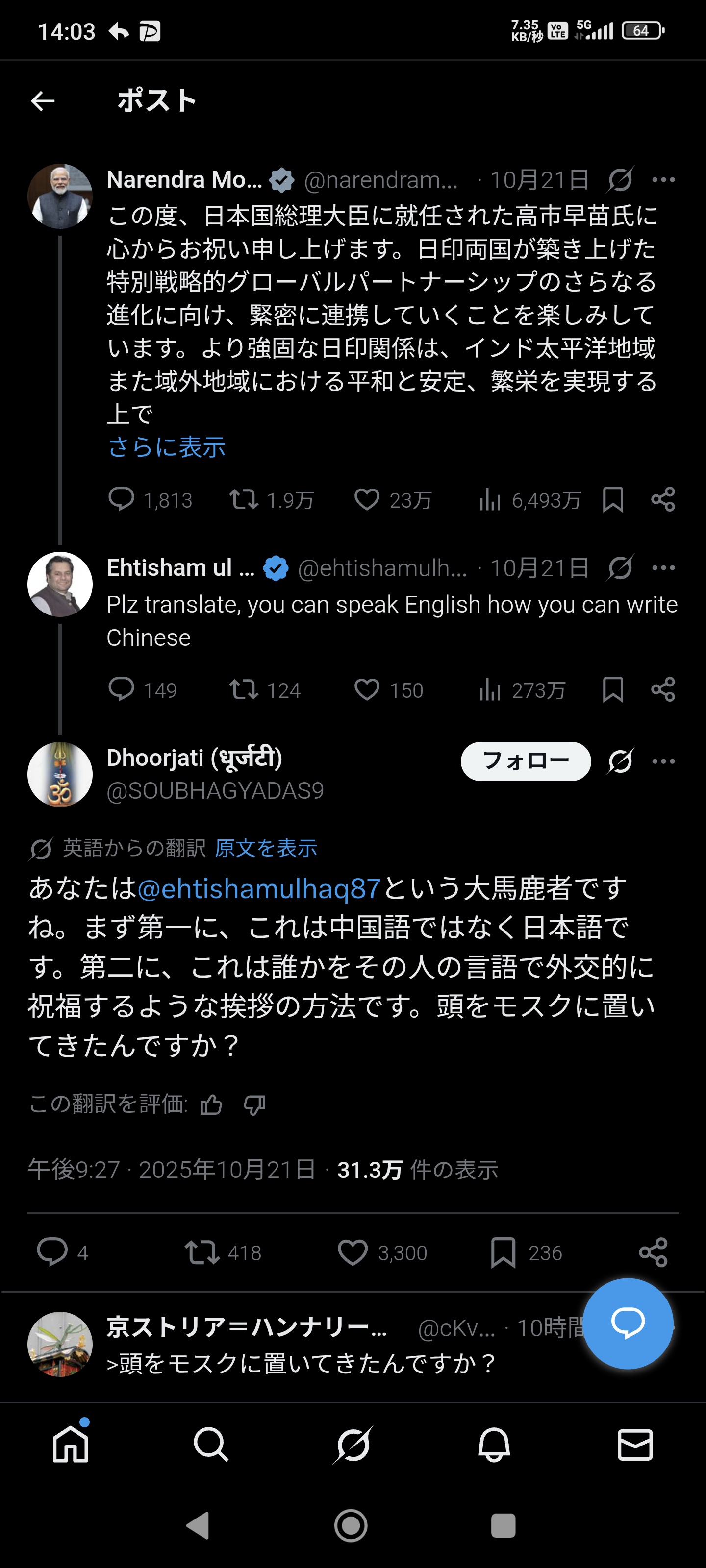 【悲報】外人のレスバ、ちょっとオシャレで草。パキスタン人「中国語分かんねーよ」→インド人「日本語だが?脳みそモスクに忘れてきたのか?」