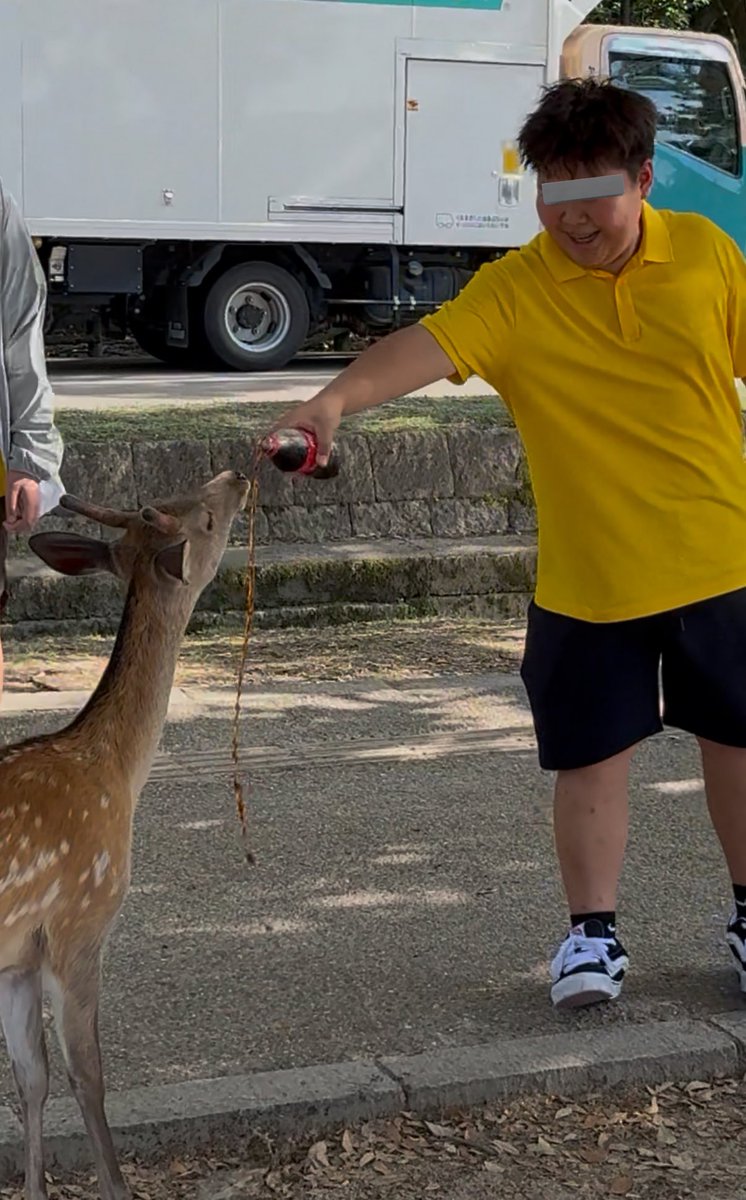 【画像】中国のクソガキ、奈良のシカに「コーラ」を飲ませるwwww
