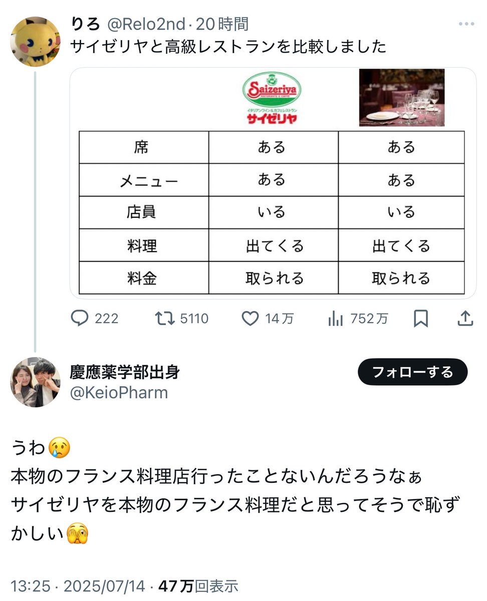【悲報】X民「サイゼと高級レストランを比較しました」→慶應薬学部出身「サイゼリヤを本物のフランス料理だと思ってそうで恥ずかしい」