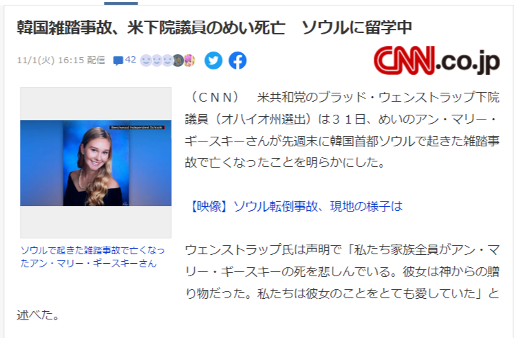 【悲報】韓国ハロウィン事件、国際問題待ったなしへ。『米下院議員の姪』など外国の上級が多数亡くなってしまう…