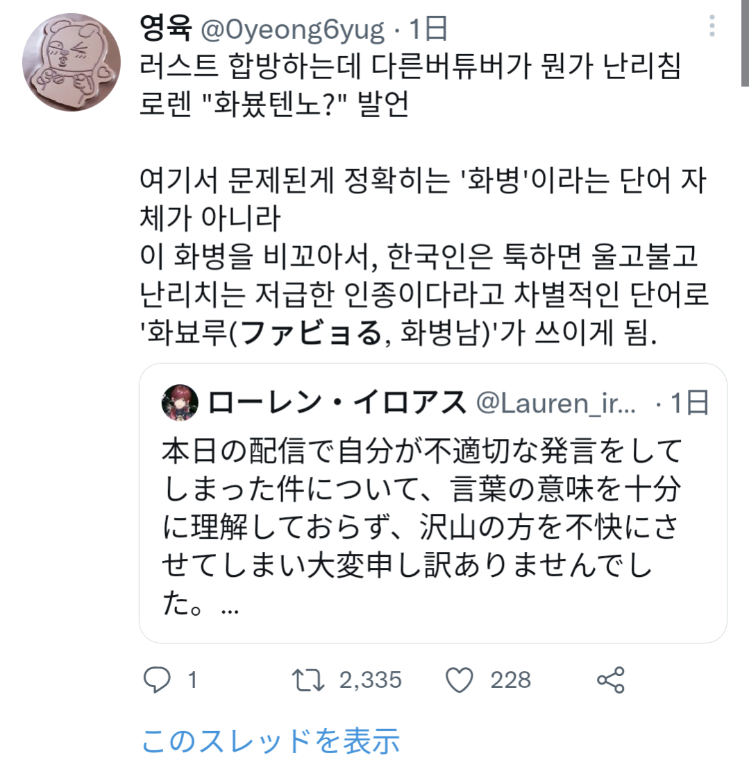 【悲報】韓国人への差別発言で炎上したにじさんじVtuberのローレン・イロアスさん、無事韓国人にもバレ国際問題へ発展