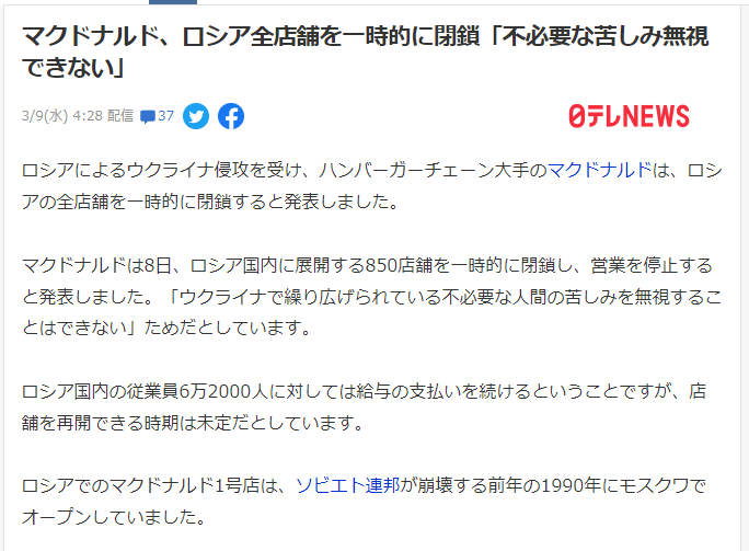 マクドナルド「ロシアの全850店舗を閉鎖する。従業員62000人の給与は支払い続ける」