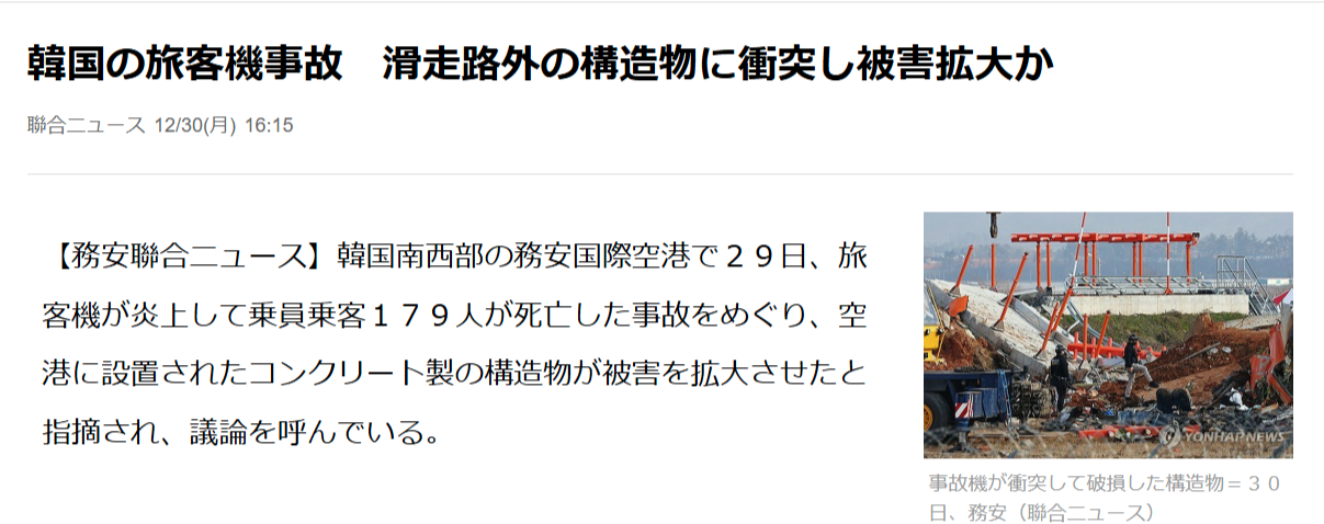 【悲報】韓国旅客機事故の例の壁、海外で「Death Wall(死の壁)」と名付けられてしまう…