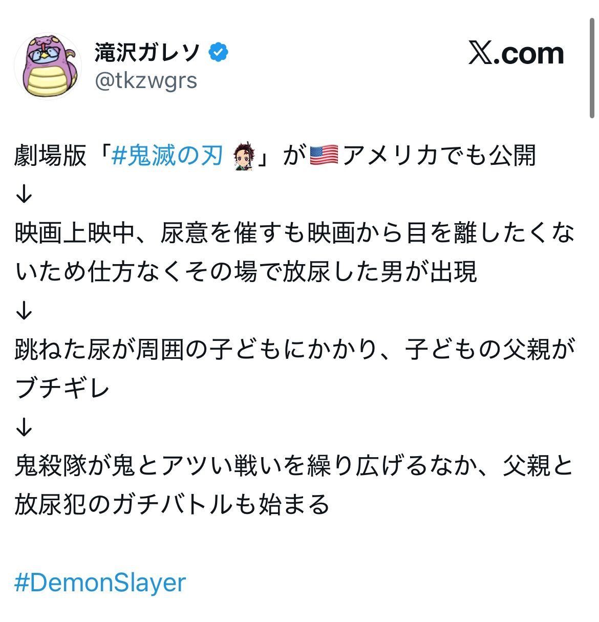 【悲報】外人さん、鬼滅の上映中に我慢できずその場で放尿→悲惨な結果になるwwww