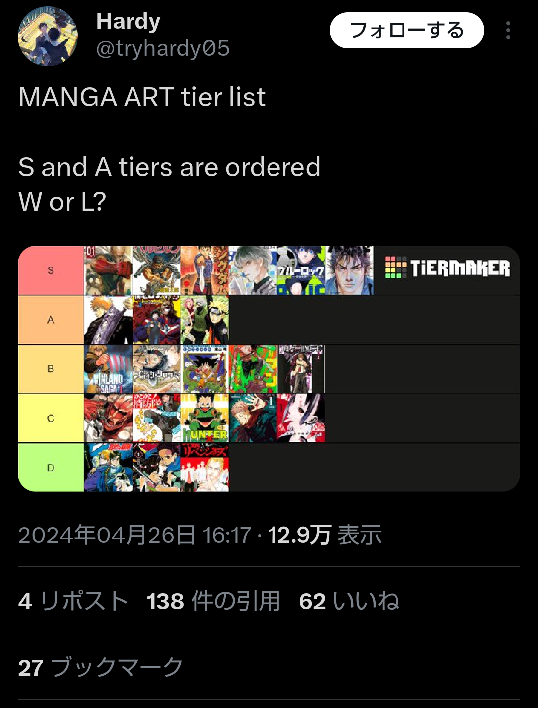 【画像】外人「画力の高い漫画家でtier表作ったぞ!」←62いいねwwww
