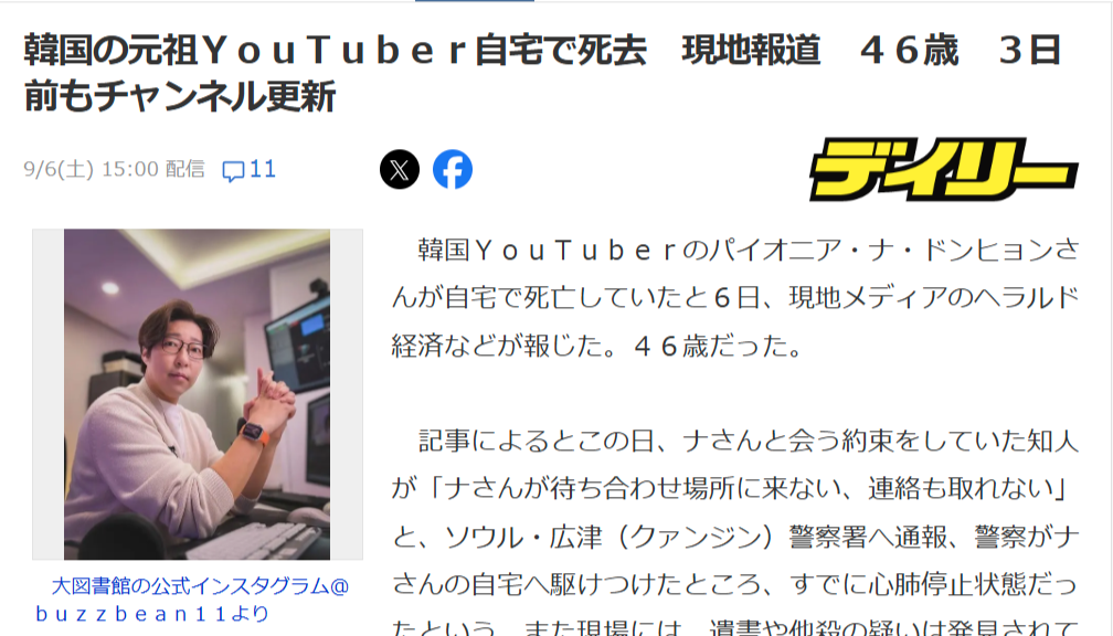 【訃報】韓国の元祖YouTuber、46歳という若さで死去。3日前もチャンネル更新