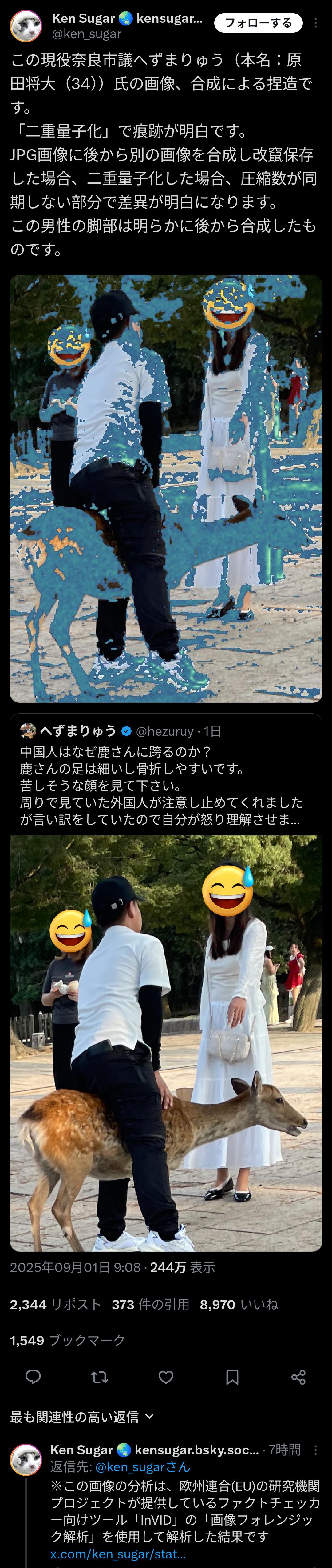 【悲報】へずまりゅう議員がポストした中国人が鹿を虐める画像、捏造AI合成疑惑がかけられる→本人は否定wwww