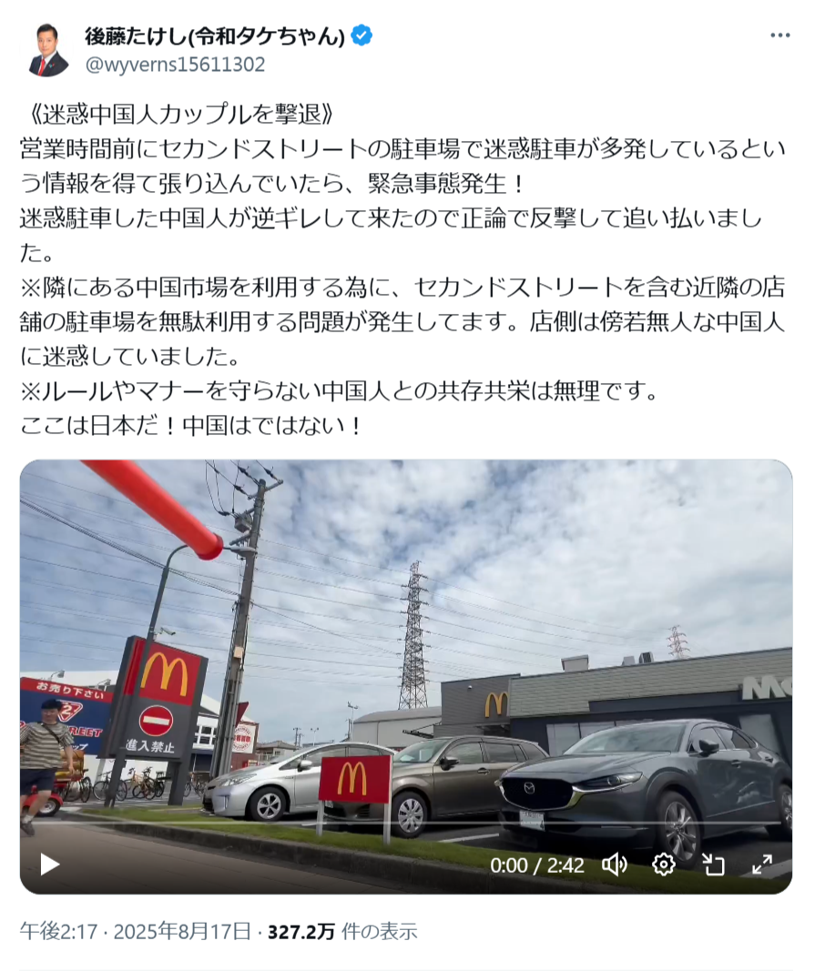 【悲報】インフルエンサーさん、迷惑駐車をする中国人カップルを撃退するwwww