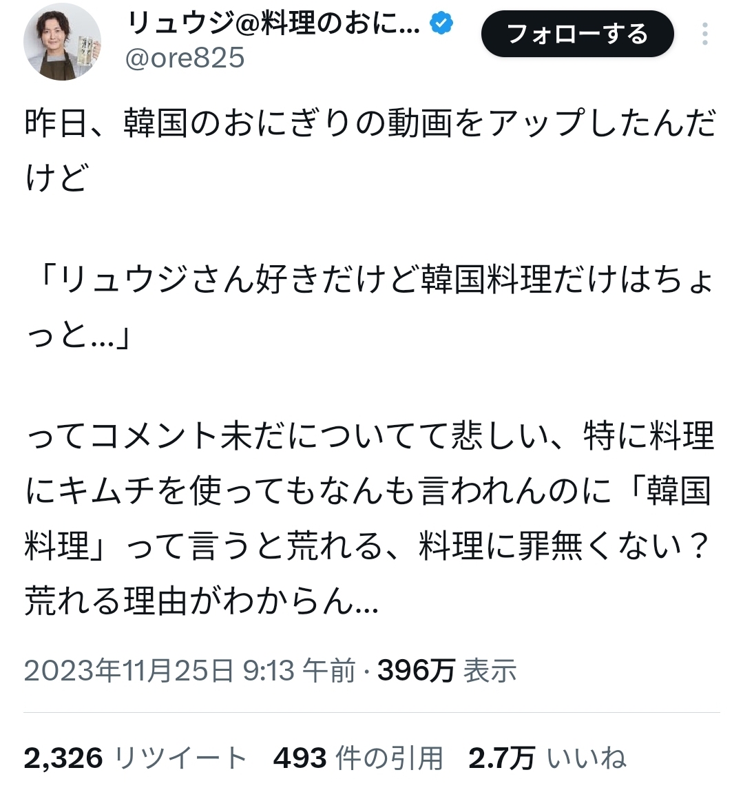 【悲報】料理研究家リュウジ「韓国のおにぎりを作ったよ」→愛国者さん大激怒www
