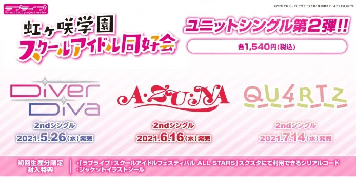 《ラブライブ!虹ヶ咲学園》から「DiverDiva」「A・ZU・NA」「QU4RTZ」2ndシングル予約開始!いずれも新規楽曲2曲+Off Vocal2曲+新規録り下ろしドラマが収録