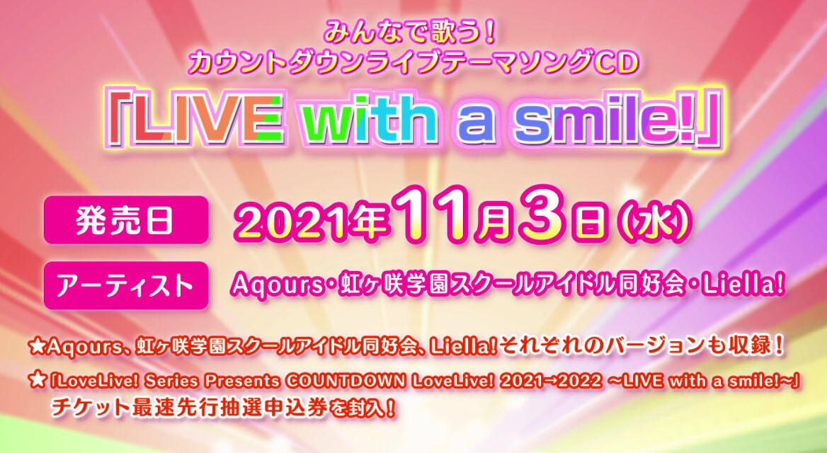 《ラブライブ!》年越しライブのテーマソングCD「LIVE with a smile!」予約開始!初回特典として同ライブのイベント最速先行抽選申込券が封入