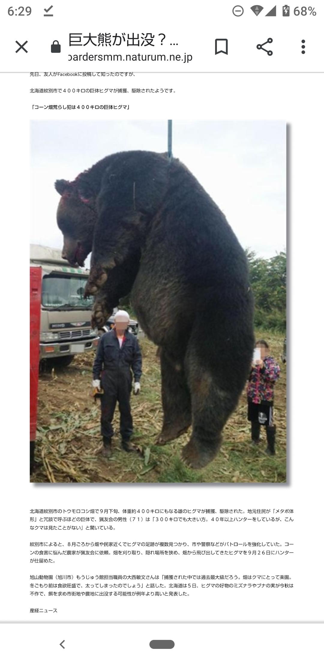 【画像】北海道でトウキビ畑を荒らし回ったヒグマ、捕獲されDBDみたいに吊られてしまう…