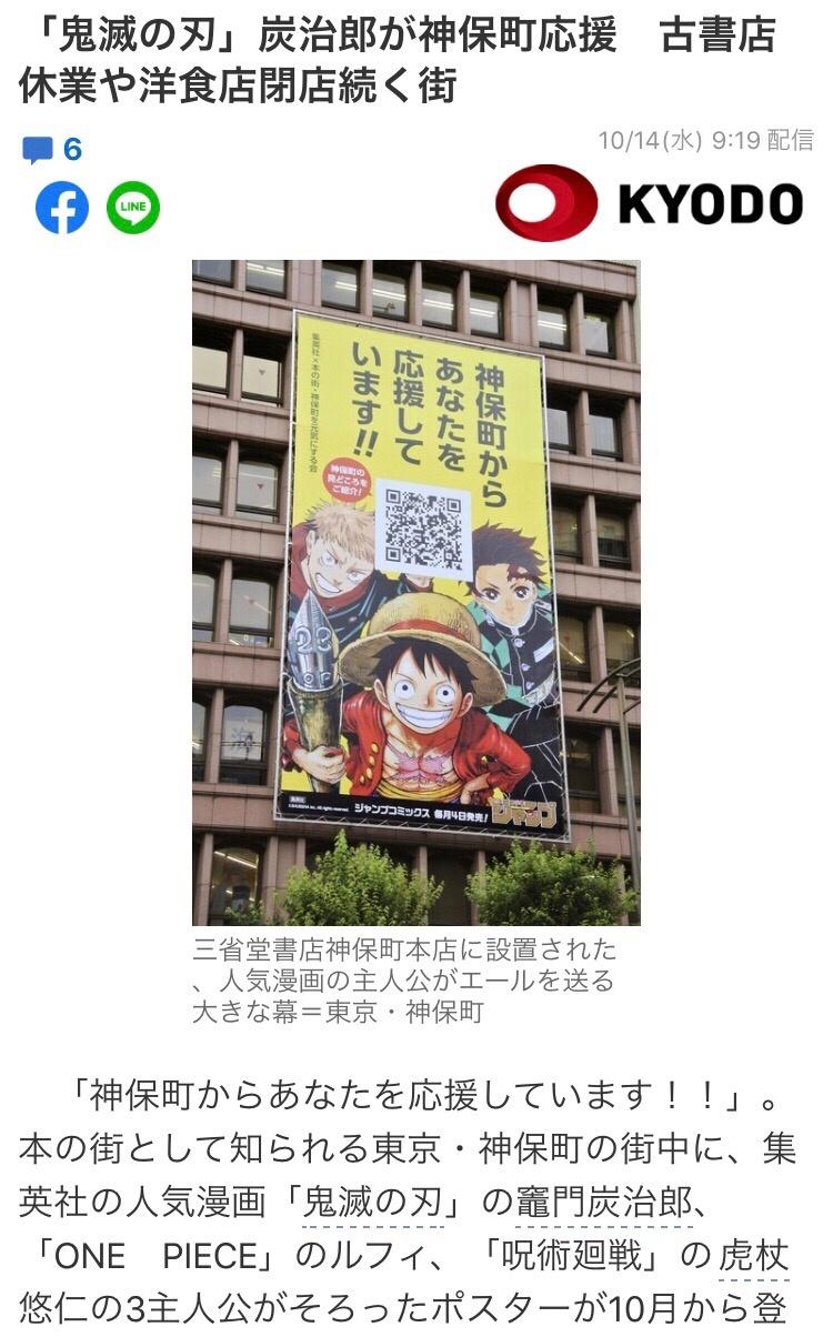 【画像】「鬼滅の炭治郎が本の街から応援」というニュースが出る→ルフィも追加され修正された模様