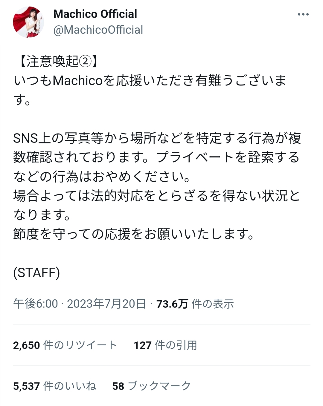 声優machico「写真から場所を特定するのやめてください、場合によっては法的措置とります」