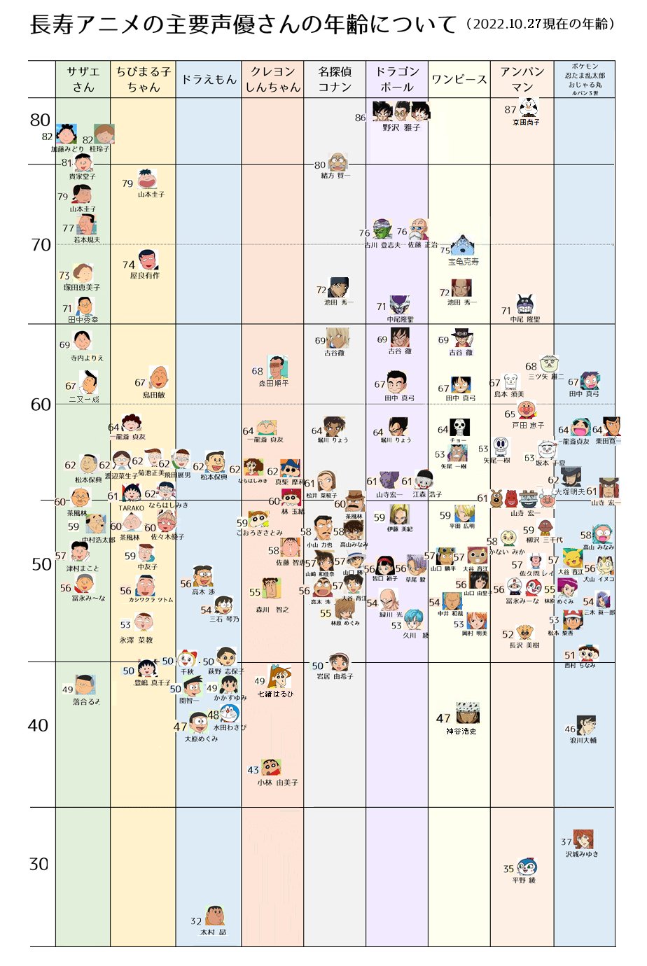【画像】長寿アニメの声優の年齢表って今こんな感じなんだ