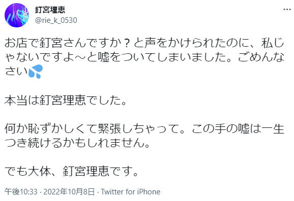 声優・釘宮理恵さん、お店で「釘宮さんですか?」と聞かれ嘘をついてしまう・・・
