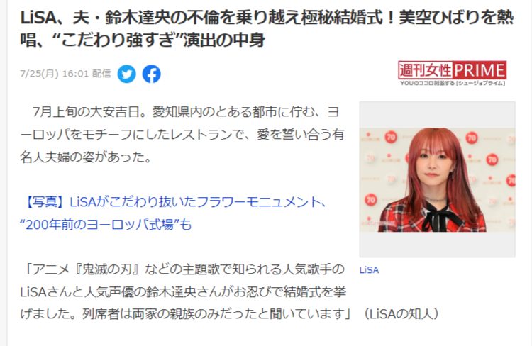 LiSAさん、旦那である声優・鈴木達央さんの不倫を許し『極秘結婚式』を行っていたことが判明