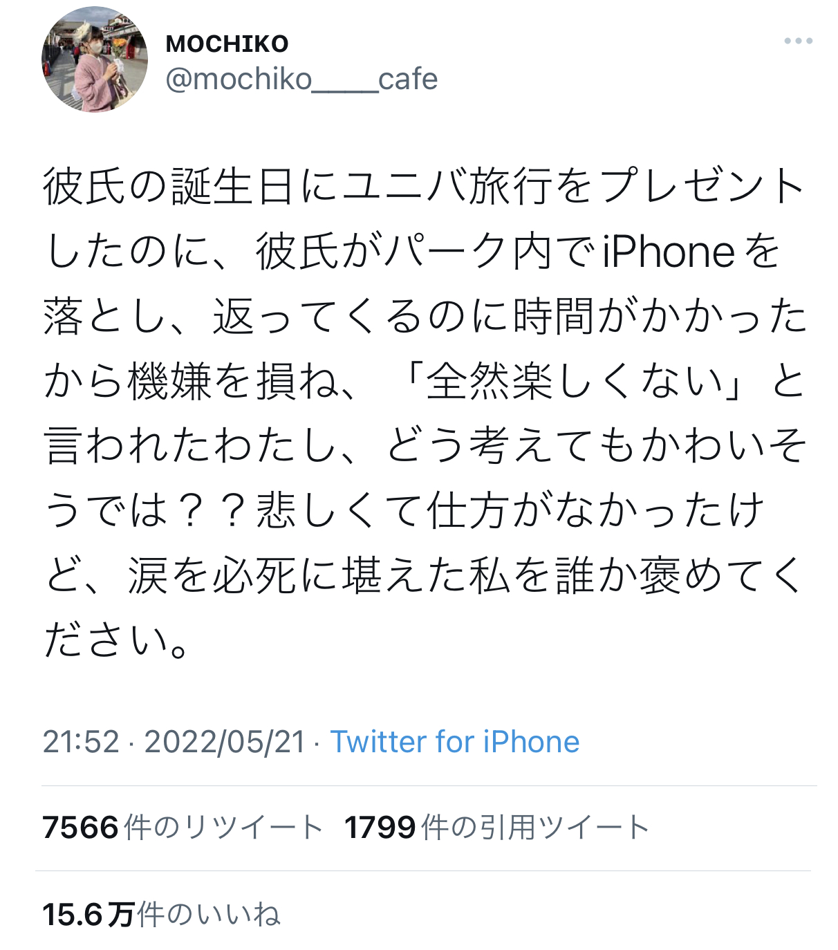 Twitter女子さん「プレゼントしたユニバ旅行中、彼氏がiPhone落として機嫌損ねられた」←15万いいね