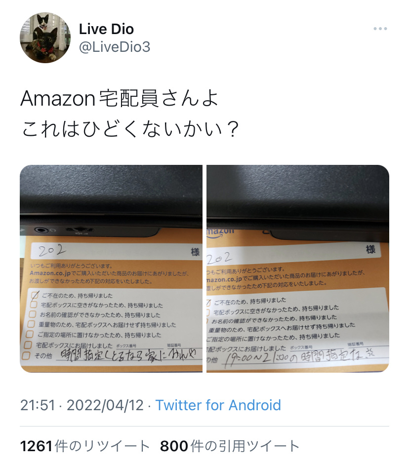 【悲報】Amazon配達員にブチギレたTwitter民、鍵垢で逃亡してしまう