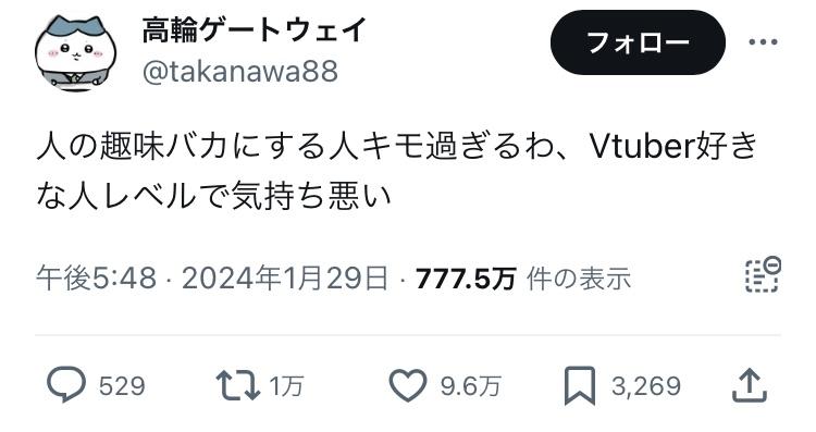 【悲報】Vtuberオタクを馬鹿にするツイート、めちゃくちゃバズる……