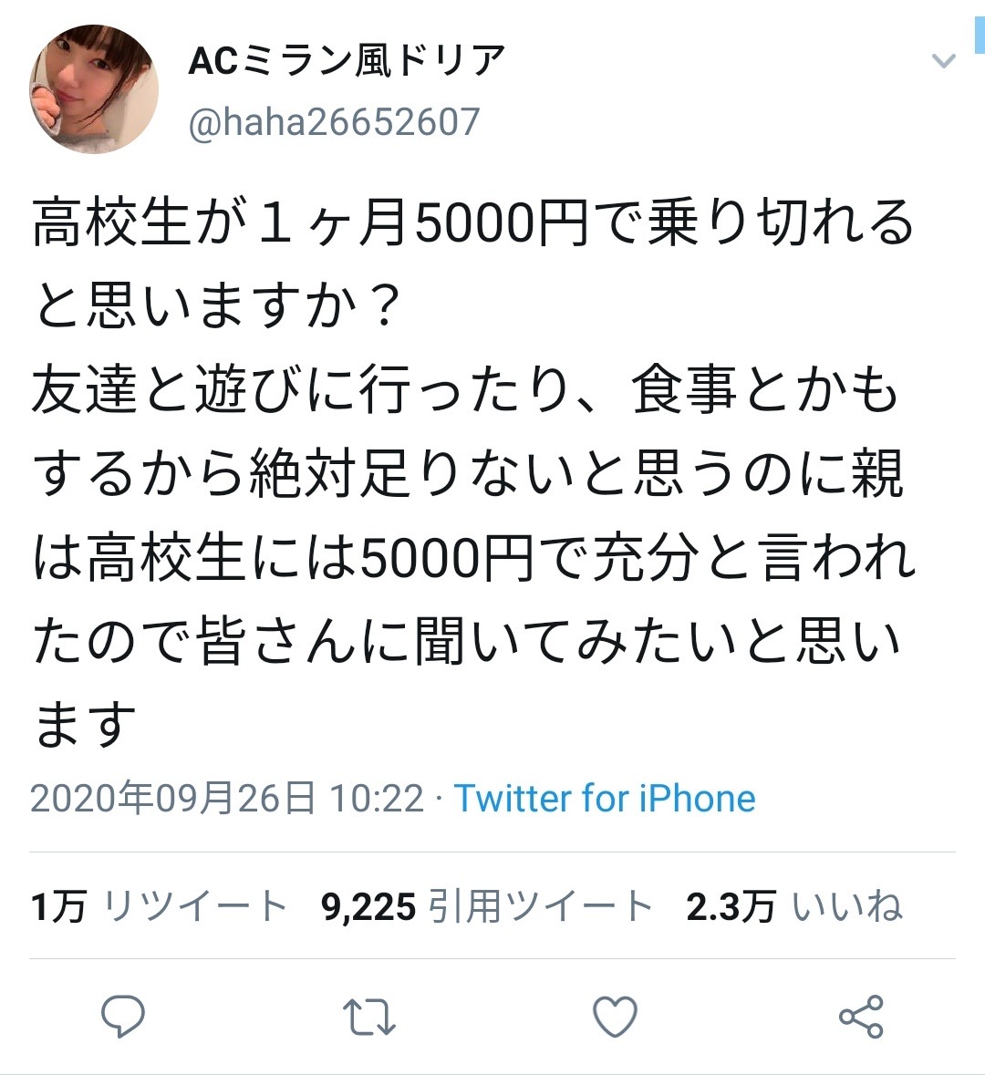 【悲報】ここ数日間Twitterで議論を呼んでいた「高校生の月の小遣い5000円少なすぎ」問題、終了する