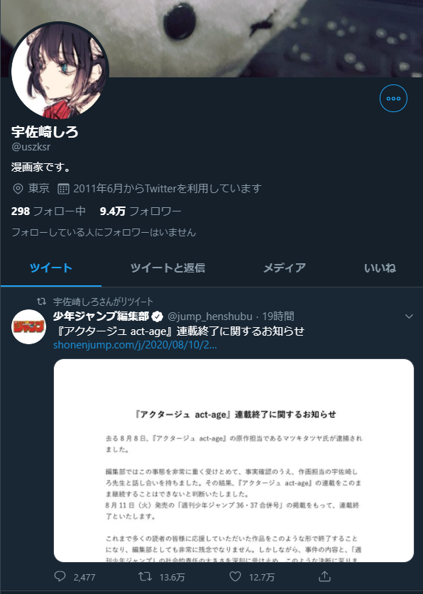 【悲報】アクタージュ作画担当の宇佐崎しろ先生、ツイッター更新せず連載終了のリツイートしかしない