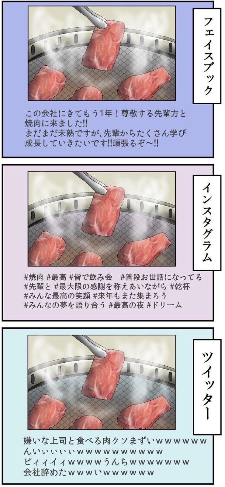 【画像】漫画家さん、「FB」「インスタ」「Twitter」それぞれの投稿内容の違いを描くwwwww