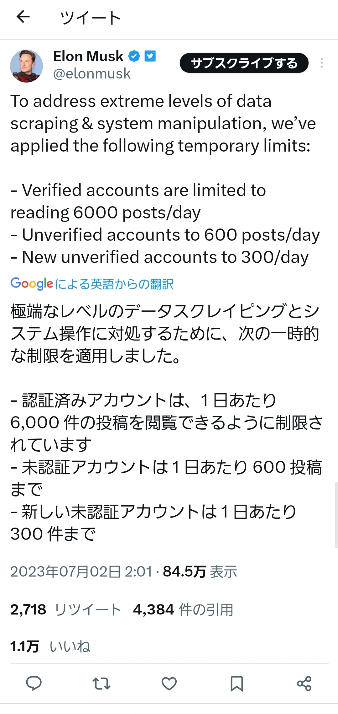 【悲報】イーロン・マスク「無課金は1日に600ツイートしか閲覧できなくするわw」