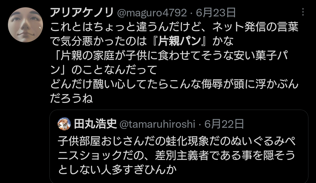 【悲報】ツイッター民、キレる「片親パンだぁ?どれだけ醜い心してたらこんな侮辱頭に浮かぶんだよ!!」