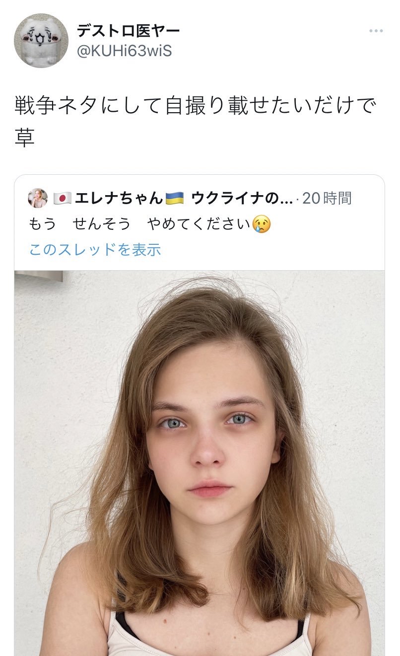 【悲報】ウクライナ美女「もう せんそう やめてください(自撮りパシャッ」害悪系Twitter民「シュパパパパ!」