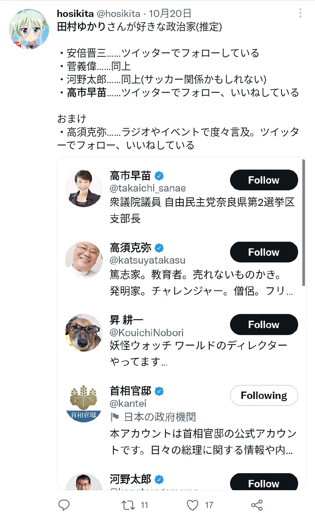 【悲報】人気声優の田村ゆかりさん、高市早苗のツイートに『いいね』を押してしまい炎上してしまうwwwww