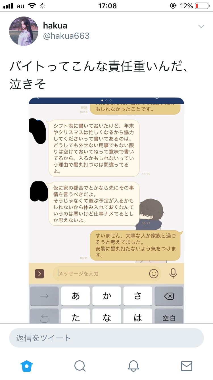 【画像】ツイッター女さん「バイトってこんなに責任重いんだ・・泣きそう・・・」