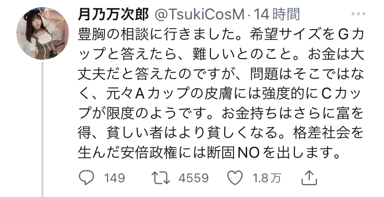 【悲報】Twitter女子「豊胸の相談に行ったら希望サイズは無理だと言われた。…安倍が悪い。」←1.8万イイネwwww