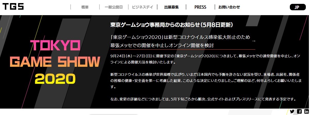 東京ゲームショウが通常開催を中止、オンラインによる開催を検討へ