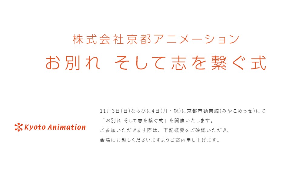 京アニ、ファン向け追悼行事「お別れ そして志を繋ぐ式」11月に開催へ