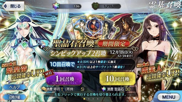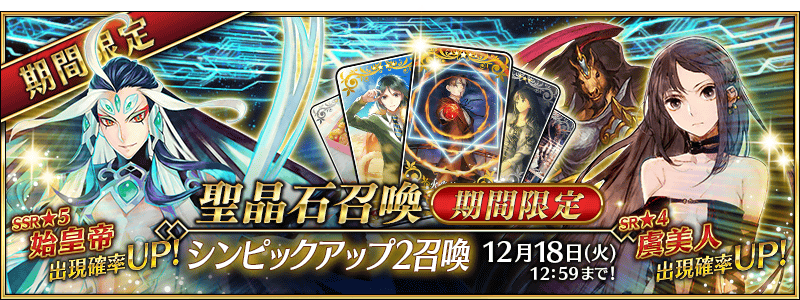 『FGO』シンピックアップ2召喚で★5始皇帝、★4虞美人、★3赤兎馬が登場!
