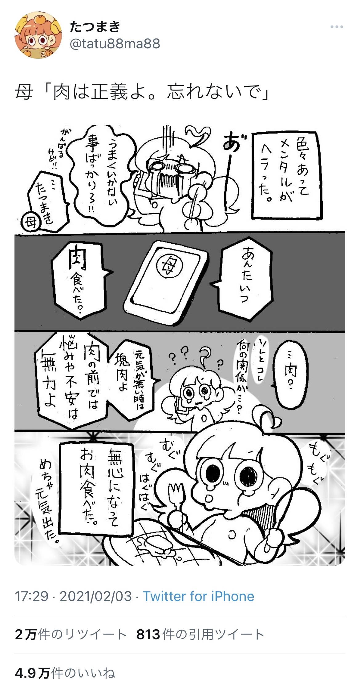 Twitter「メンタル弱った時は肉を食え。肉は正義」4万いいね←これwwwwww