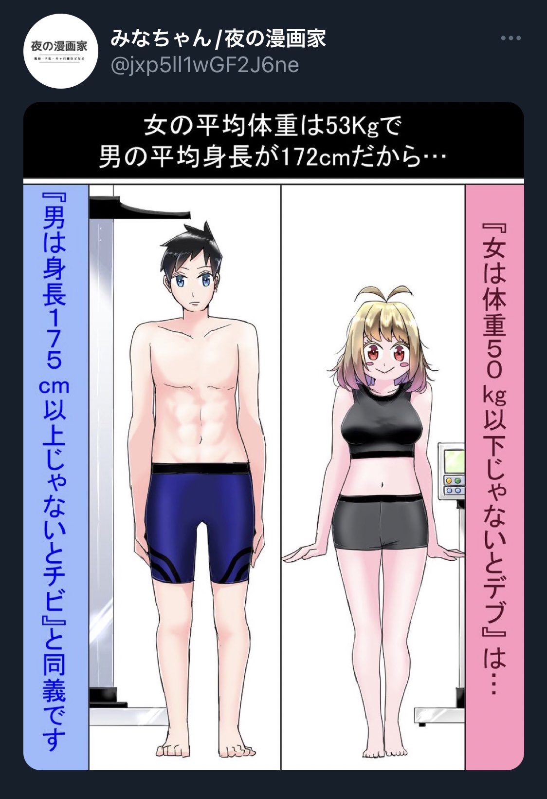 まん画家さん「女で50kgはデブだって言う男いるけど175cm以下はチビだよって言うのと同じ暴言だって話は前にしたっけ?」