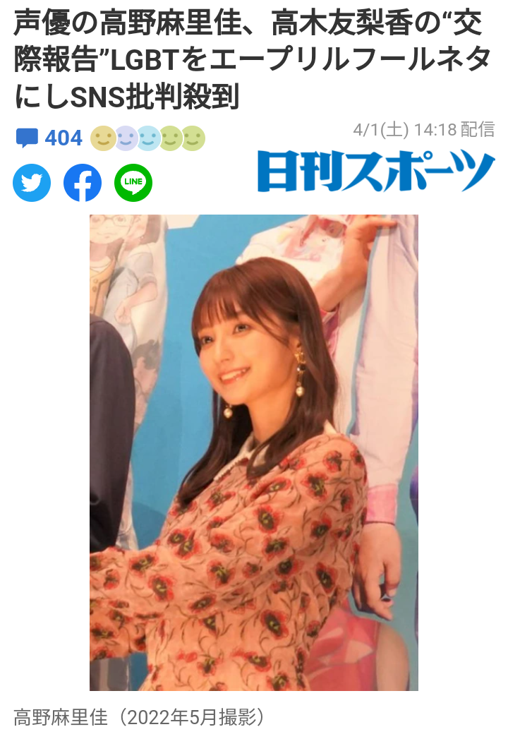 【悲報】炎上中の高野麻里佳さん、「LGBTは異常」というツイートにいいね♥してしまうwww