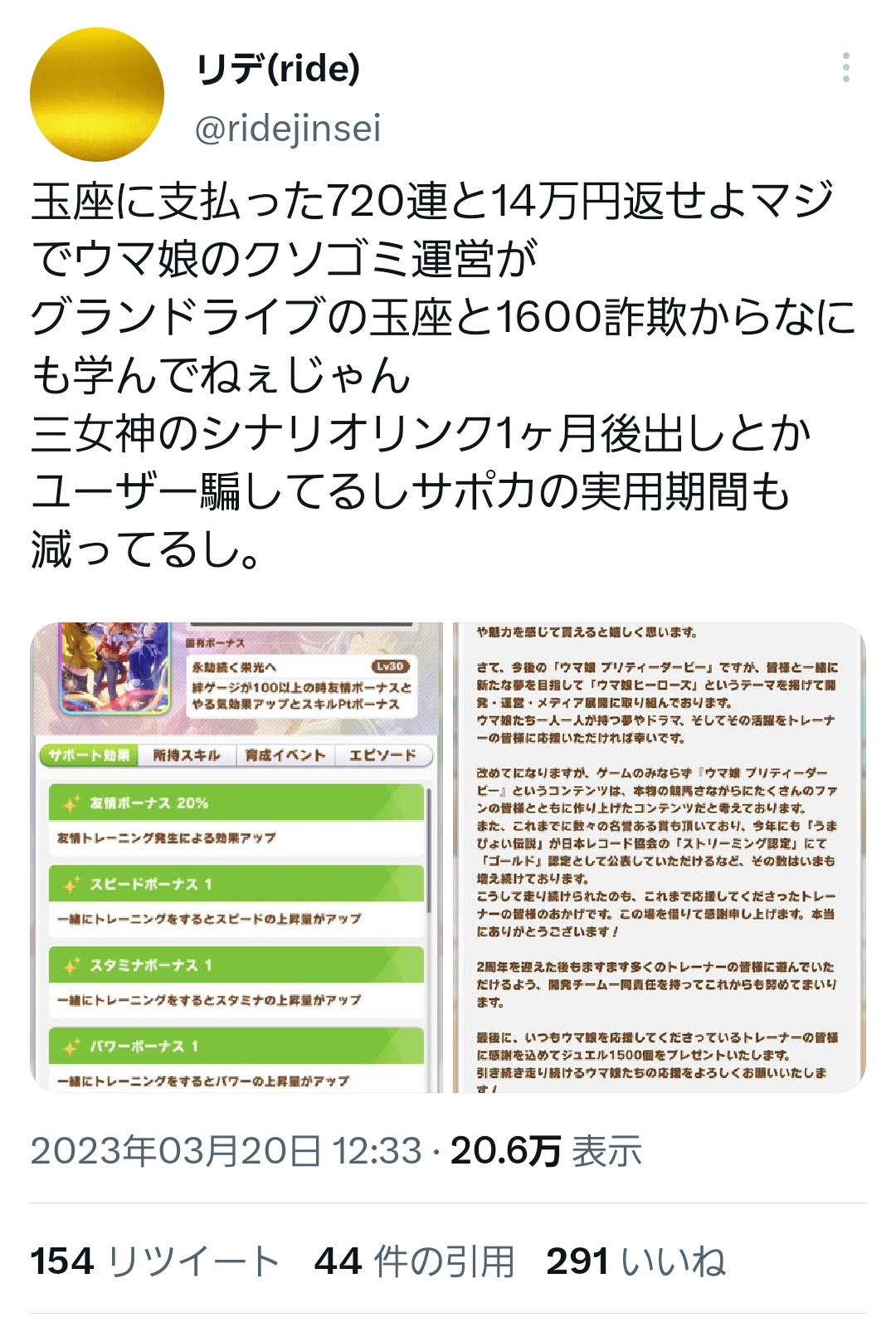 【悲報】ウマ娘さん、過去最高レベルに炎上してしまうwww後出しのシナリオリンクで玉座がまたしても便座になったためwww
