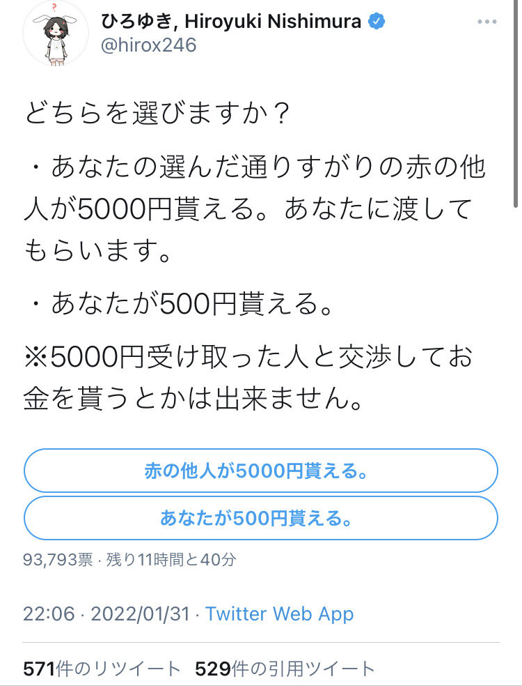 論破王・ひろゆき「赤の他人が5000円貰えるか、あなたが500円貰えるか、どっちがいい?」