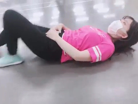 地面を仰向けになって移動する女性(声優)