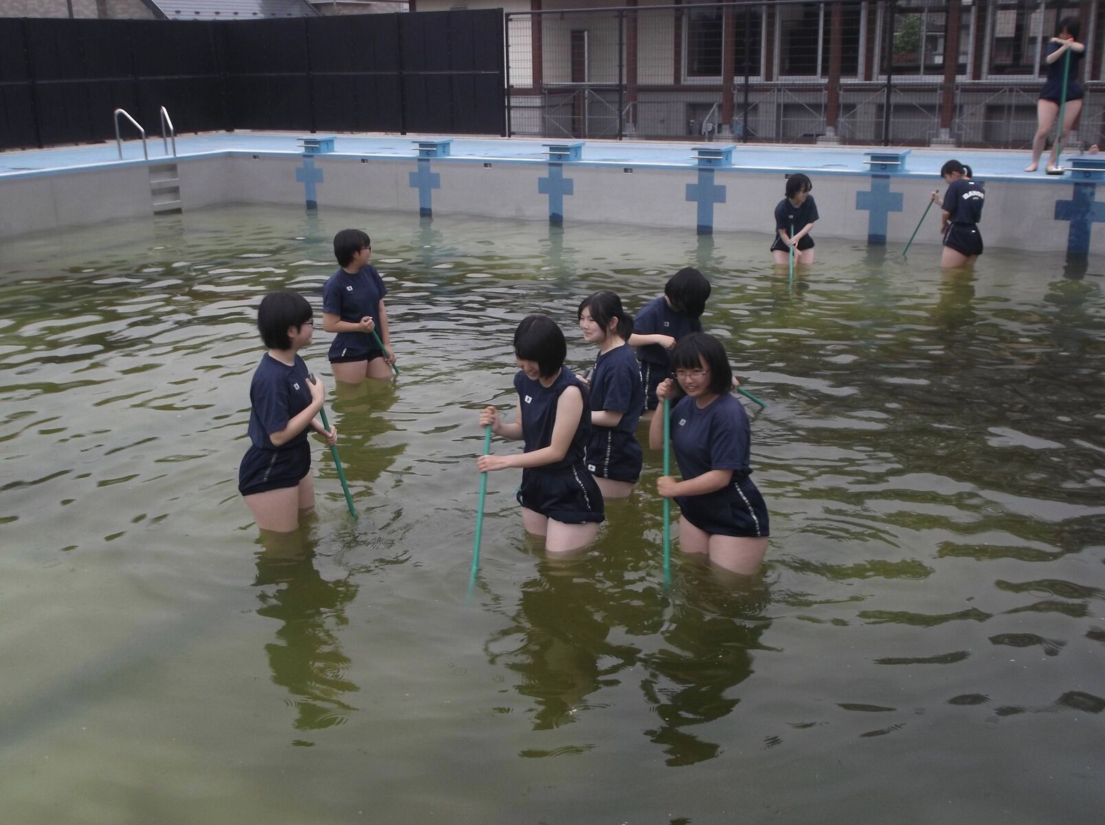 【画像】めっちゃ汚いプールを清掃する女子部員たち
