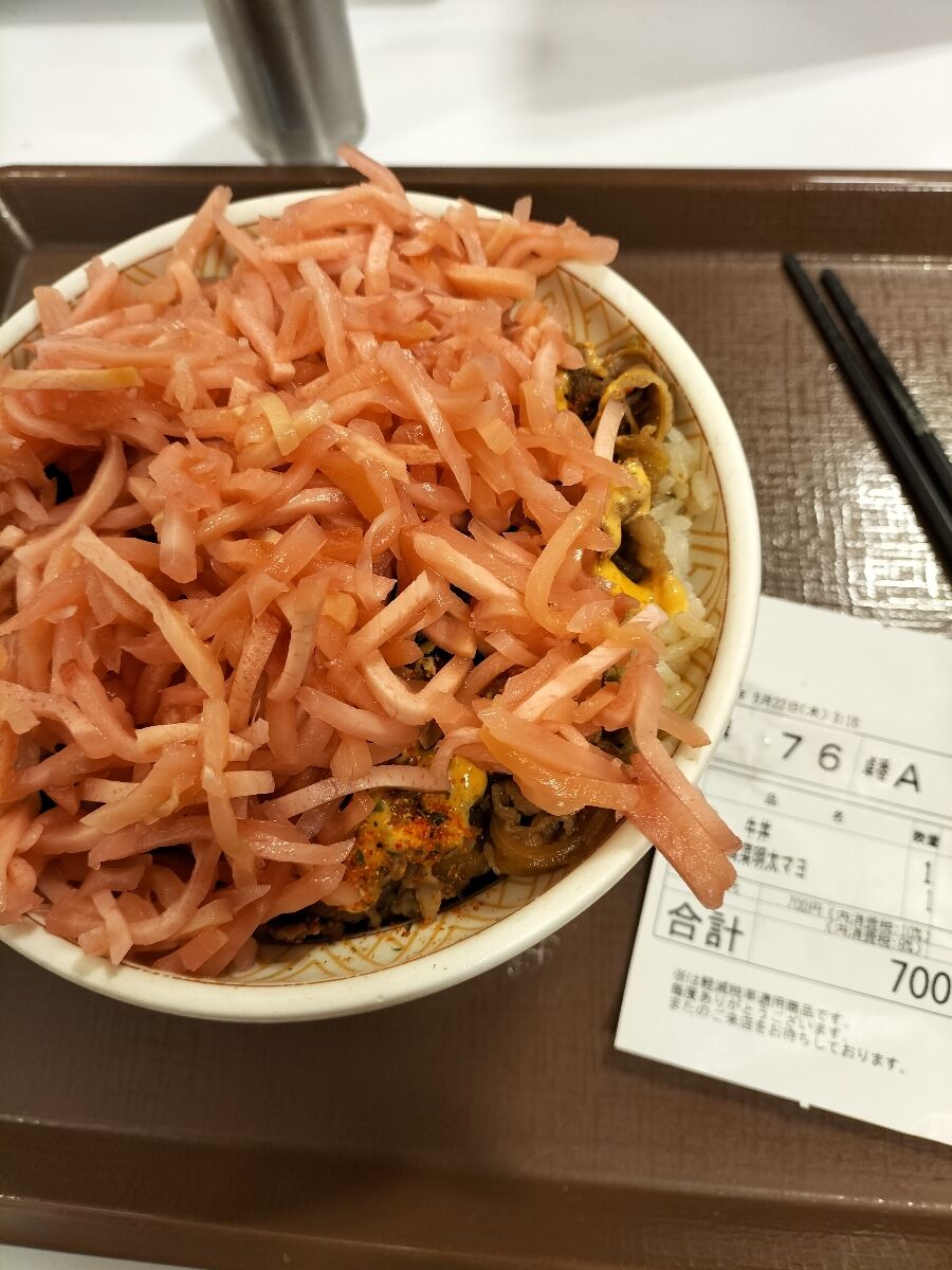 【画像】グルメ漫画の影響で、紅しょうがたっぷりの牛丼を食べてきたぞ