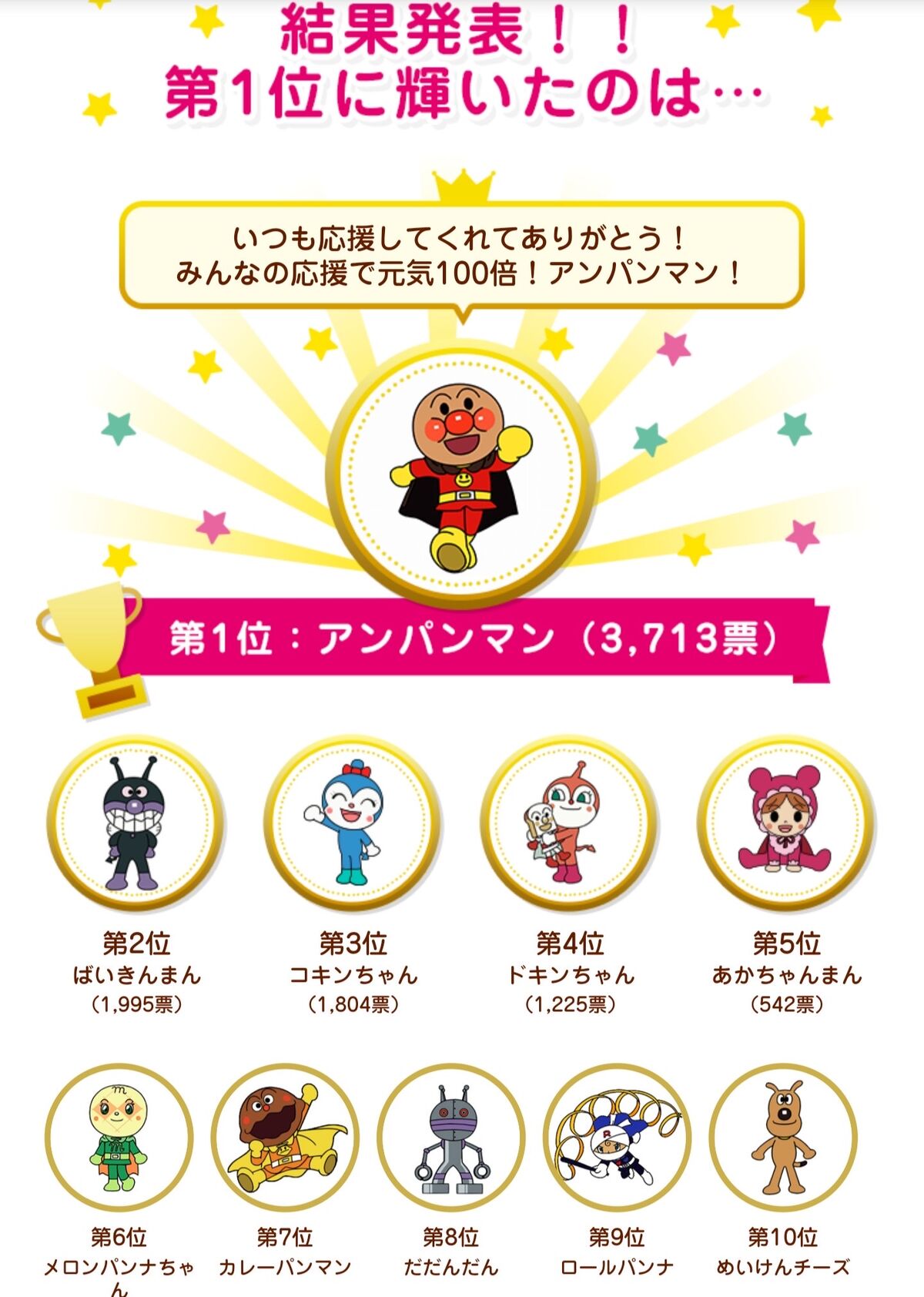 【画像】アンパンマンの人気投票、2~4位をカビ勢に奪われる