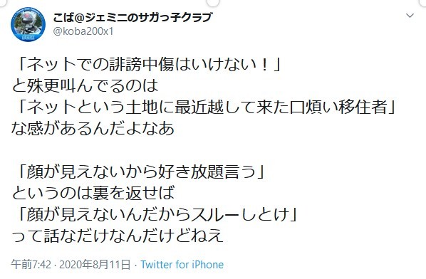 【悲報】ツイッター民さん「ネットの誹謗中傷を批判するのは口うるさい移住者」