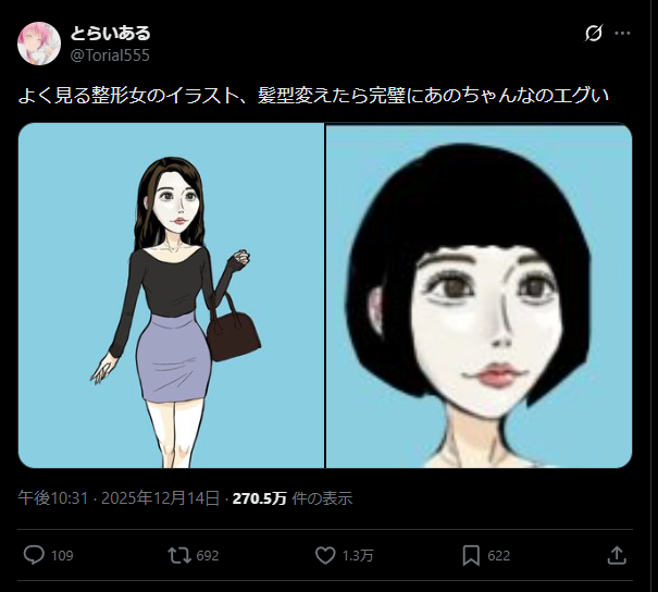 【画像】アニメアイコン、一線を超える「整形カリカリ女のイラスト、髪型変えたら…」